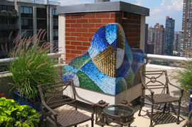 Exterior wall mosaics and fountain at Private Residence Penthouse, Midtown, New York City. |